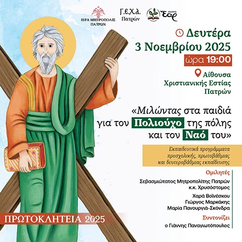 Τη Δευτέρα 3 Νοεμβρίου και ώρα 7:00 οι εκπαιδευτικοί προσχολικής, πρωτοβάθμιας και δευτεροβάθμιας εκπαίδευσης, καθώς και γονείς και κατηχητές, θα έχουν τη δυνατότητα να παρακολουθήσουν εκπαιδευτικά προγράμματα, που αφορούν στον ναό του Αγίου Ανδρέα, … Διαβάστε περισσότερα -