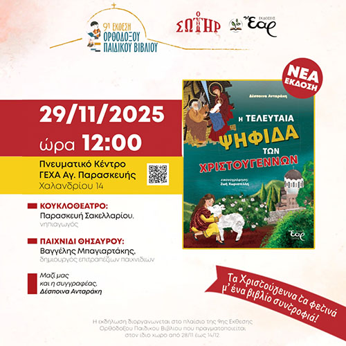 Στο πλαίσιο της 9ης Έκθεσης Ορθόδοξου Παιδικού Βιβλίου, οι Εκδόσεις «Ο Σωτήρ» και οι Εκδόσεις «Έαρ» προσκαλούν τους μικρούς μας φίλους σε μια ξεχωριστή μέρα! Το Σάββατο, 29 Νοεμβρίου 2025, στις 12:00 μ., στο … Διαβάστε περισσότερα -