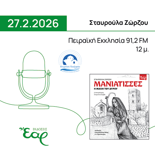 Την Παρασκευή 27 Φεβρουαρίου 2026 στις 12 μ., η κ. Σταυρούλα Ζώρζου θα φιλοξενηθεί στην εκπομπή «Ραδιο-Παραμυθία» της κ. Σοφίας Χατζή στην Πειραϊκή Εκκλησία, όπου θα συζητήσουν σχετικά με το βιβλίο της «Μανιάτισσες». -