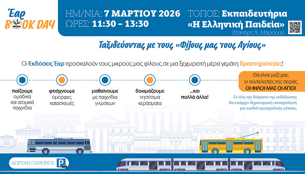 Οι Εκδόσεις Έαρ προσκαλούν τους μικρούς τους φίλους σε μια ξεχωριστή μέρα γεμάτη χαμόγελα, δημιουργίες και γνώσεις το Σάββατο 7 Μαρτίου 2026, από τις 11:30 έως τις 13:30, στα Εκπαιδευτήρια «Η Ελληνική Παιδεία» (Κανάρη 9, Μαρούσι).
