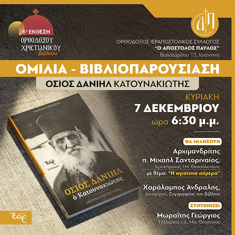 Ο Ορθόδοξος Ιεραποστολικός Σύλλογος «Ο Απόστολος Παύλος» και οι Εκδόσεις «Έαρ» διοργανώνουν εκδήλωση με αφορμή την κυκλοφορία του βιβλίου «ΟΣΙΟΣ ΔΑΝΙΗΛ ο Κατουνακιώτης».