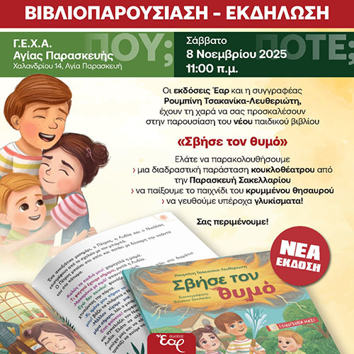 Η εκδήλωση θα πραγματοποιηθεί το Σάββατο 8 Νοεμβρίου στις 11 π.μ. στην ΓΕΧΑ Αγίας Παρασκευής, Χαλανδρίου 14.