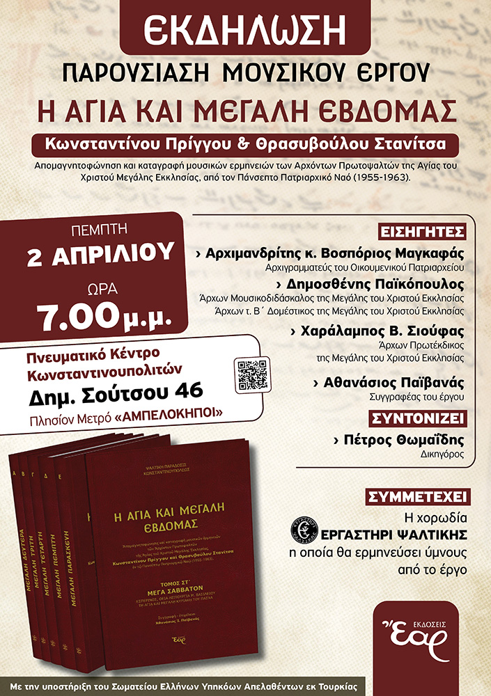 Οι Εκδόσεις «Έαρ» διοργανώνουν εκδήλωση για την παρουσίαση του μνημειώδους μουσικού έργου «Η Αγία και Μεγάλη Εβδομάς». Το έργο αυτό αποτελεί απομαγνητοφώνηση και καταγραφή μουσικών ερμηνειών των Αρχόντων Πρωτοψαλτών της Αγίας του Χριστού Μεγάλης Εκκλησίας, Κωνσταντίνου Πρίγγου και Θρασύβουλου Στανίτσα, εν τω Πανσεπτω Πατριαρχικό Ναό (1955–1963).