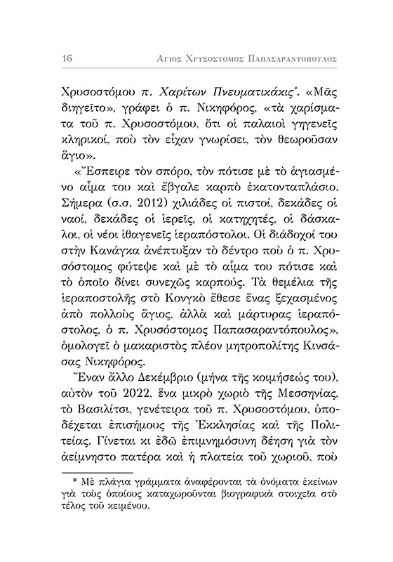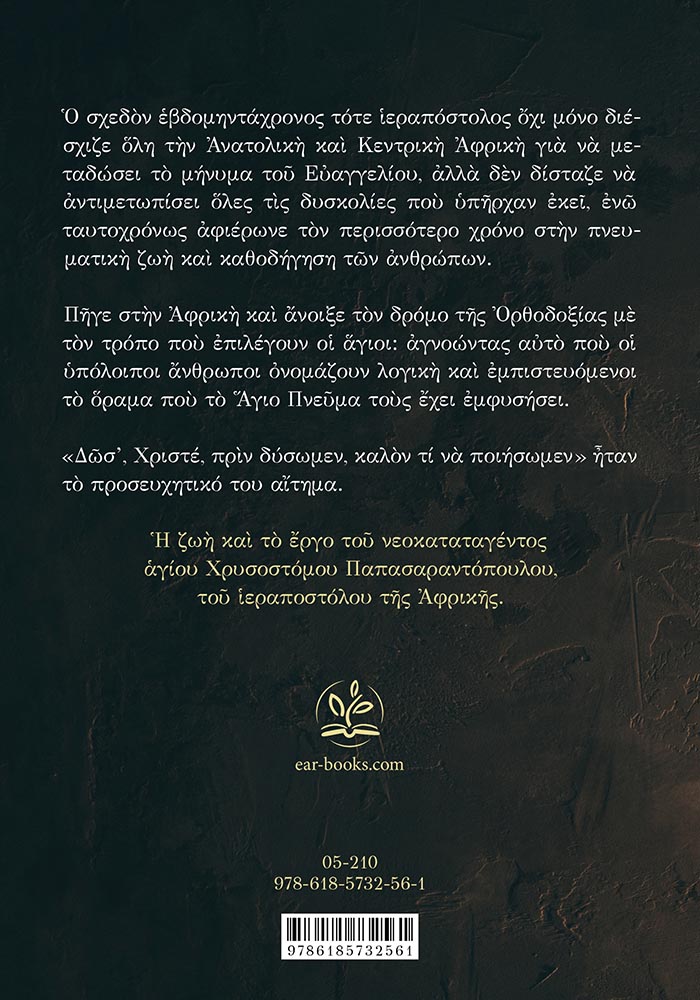 Η ζωή και το έργο του νεοκαταταγέντος αγίου Χρυσοστόμου Παπασαραντόπουλου, του ιεραποστόλου της Αφρικής. Προλογίζει ο μητροπολίτης Κινσάσας κ.κ. Θεοδόσιος.