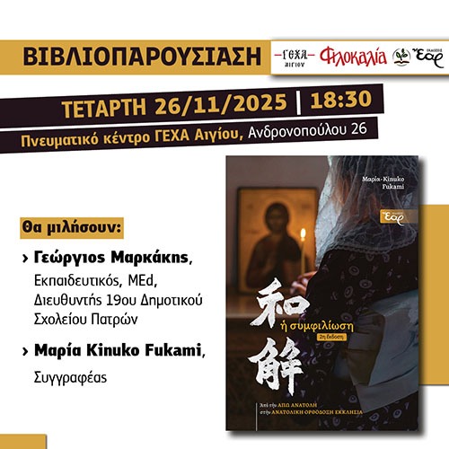Η ΓΕΧΑ Αιγίου, το βιβλιοπωλείο Φιλοκαλία και οι Εκδόσεις Έαρ σας προσκαλούν στην παρουσίαση του βιβλίου